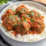 This is one of those dinners I reach for when I want something comforting that doesn’t take all evening. Juicy beef meatballs gently simmered in a bright tomato sauce, served over fluffy rice — simple flavors that feel like home. The recipe moves quickly if you stay organized, and it’s forgiving enough to be a weekday staple.