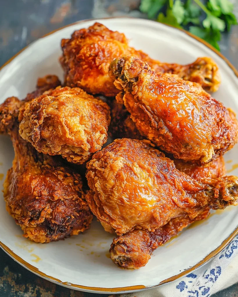 A classic Southern recipe featuring crispy, golden fried chicken with a flavorful, seasoned crust and juicy, tender meat.